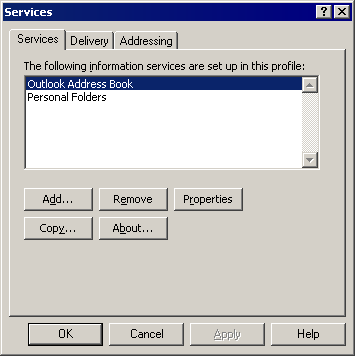 There should be at least one "Personal folder" and the "Outlook Address Book" entered here.