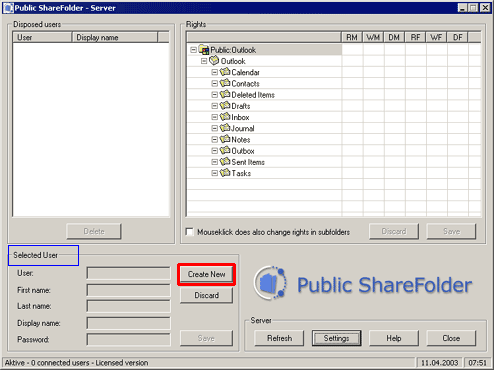 The "Display name" will appear later in the window of the Public ShareFolder Administration program so that you can see which user has been set up and which accesses the Server Outlook®, that is who is "Online" at the moment.