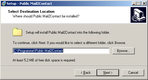 The default directory for the installation is: "C:/Program files/Public Mail 2 Contact".