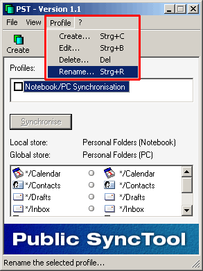 In the Public SyncTool menu line you will find the item Profile, Rename.