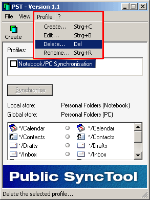 In the Public SyncTool menu line you will find the item Profile, Delete.