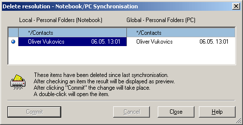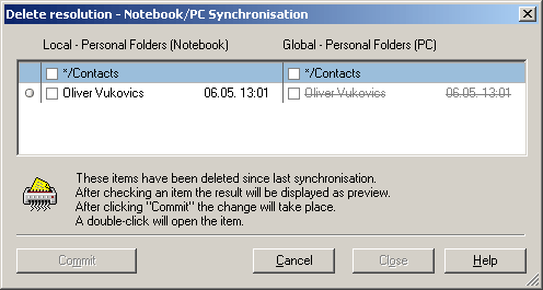 Following a 4-day business trip you return again and would like to synchronise the data entered. Without the delete resolution this would probably be your last day at this company, presuming you don’t own the company. To avoid irrevocable deletions such as this, you should leave the delete resolution switched on in the SyncTool options.