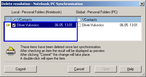 The entry is now marked with a yellow dot and on the right the entry is no longer crossed out. If you now click "Commit" the contact will be restored in the global folder.