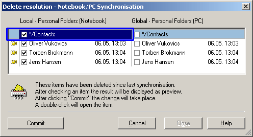 Because the Public SyncTool not only compares modified or new entries but also takes deleted entries into consideration the delete resolution is an important instrument for protecting your company from loss of data.