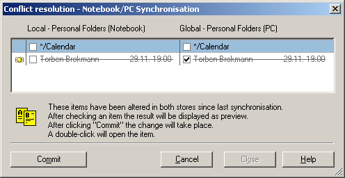 If an entry has been modified since the last synchronisation in both the local folder and also in the global folder, then SyncTool will display this entry in the conflict resolution at the end of the synchronisation. The SyncTool will hence not e.g. synchronise the chronologically most current entry on its own.