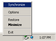 To start a synchronisation it is not necessary to open the program window. Right mouse click once on the symbol and then select Synchronise: